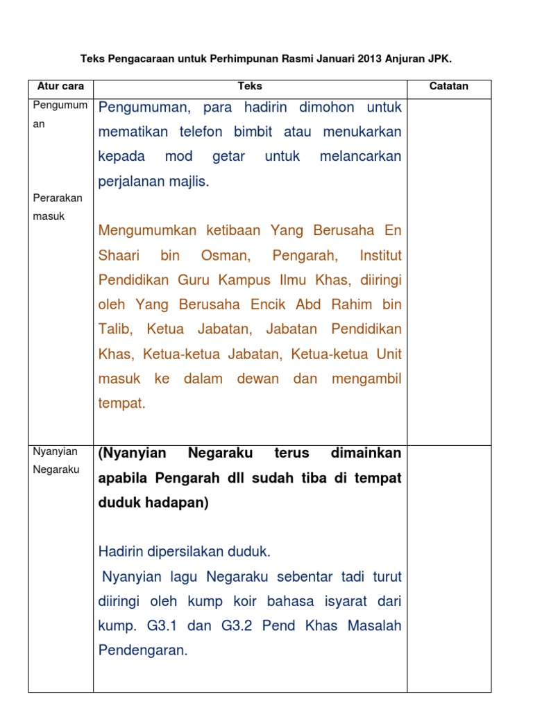 Kertas teks hendaklah bersih tidak comot dan mengikut protokol berukuran setengah A4 kertas taip biasa. Saja cy nak kongsikan teks MC majlis perhimpunan anggota jabatan cyteks ni bukan yang terbaik tetapi mungkin boleh membantu alhamdulillah masih diberi kepercayaan untuk menjadi pengacara majlisnamun begitu belum berkesempatan untuk ambil kursus pengacaraan. Masuk ke perkarangan majlis para hadirin diminta untuk berdiri.