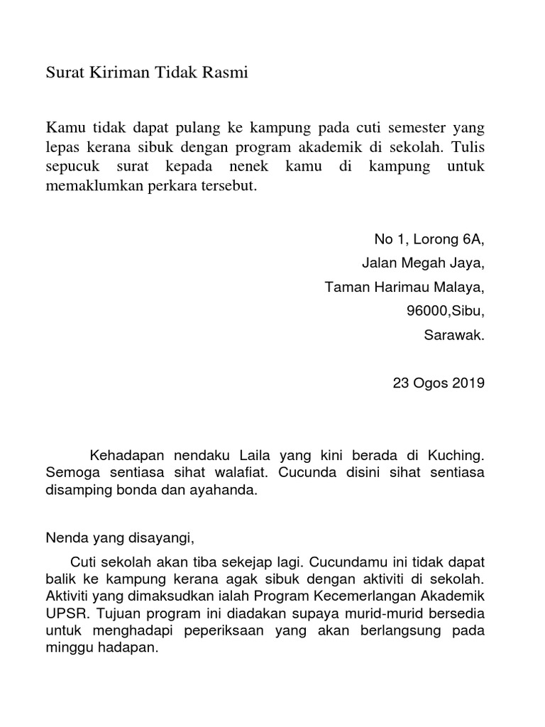 2020-01-02 Contoh Surat Kiriman Tidak Rasmi Kepada Nenek In addition it will feature a picture of a kind that may be observed in the gallery of Contoh Surat Kiriman Tidak Rasmi Kepada Nenek. 2020-07-28 Contoh surat kiriman tidak rasmi kepada kawan - Untuk melihat gambar lebih jelas pada artikel ini anda bisa klik pada gambar yang diinginkan untuk melihat gambar dalam ukuran asli atau original secara utuh. Cucunda sekeluarga di sini sihat-sihat sahaja.