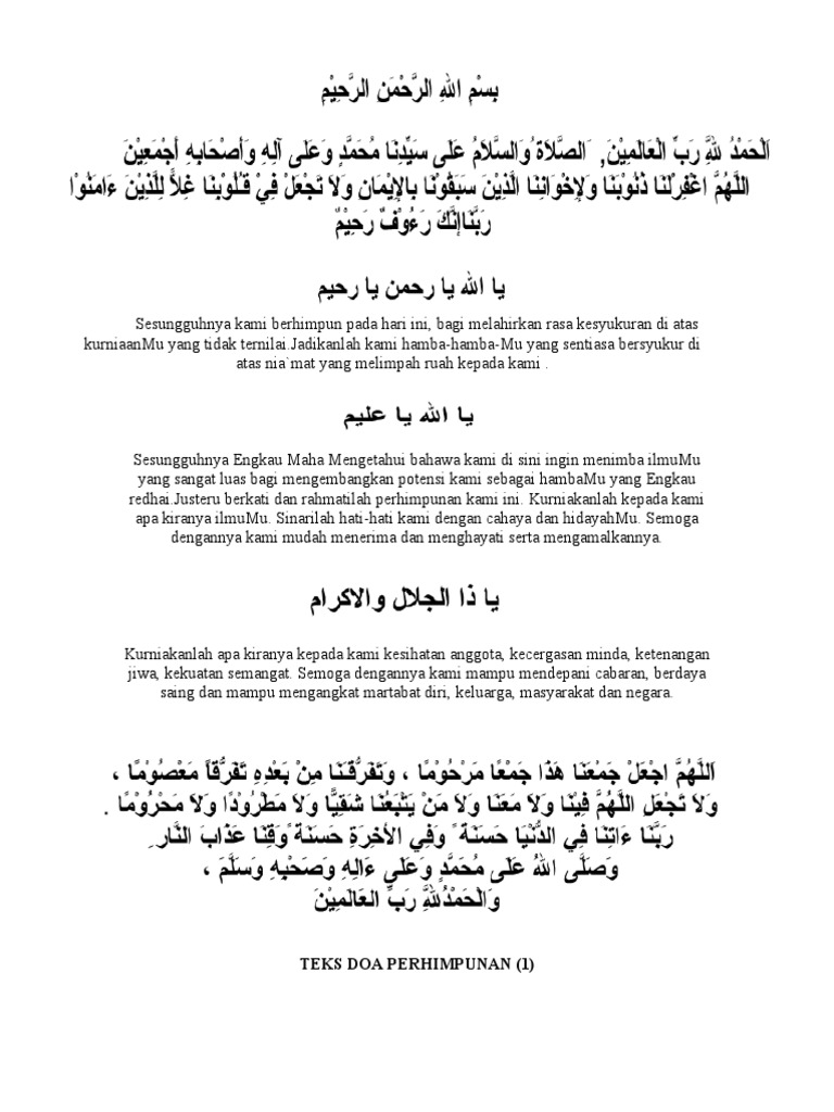 2021-06-06 Teks bacaan doa untuk majlis perhimpunan. Tak lengkap rasanya jika sesuatu majlis itu diadakan dengan tanpa iringan doa bagi memohon keselamatan dan keberkatan kepada semua yang terlibat dan juga. 2014-11-16 Bacaan doa pada awal majlis merupakan suatu perkara yang wajib dilakukan dalam setiap acara atau majlis rasmi sekolah.