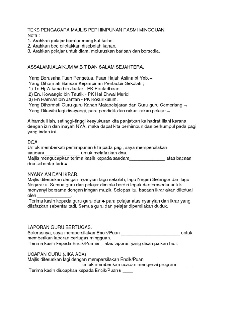 Teks Perhimpunan Rasmi Sekolah. Para pengawas diminta berbaris bagi tujuan laluan pemeriksaanMurid-murid diminta bangun dalam keadaan senyap dan teratur. Teks Ucapan Perasmian YB Ahli Dewan Undangan Negeri Maja Pahit Sempena Program Konvensyen Amalan GAP Peringkat Negeri Johor Muat Turun.