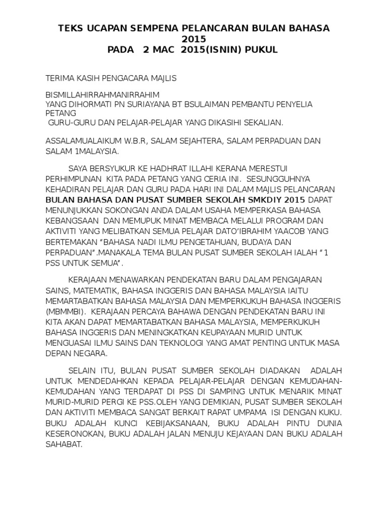 Teks Ucapan Pengetua Bulan Bahasa Dan Pss 2015